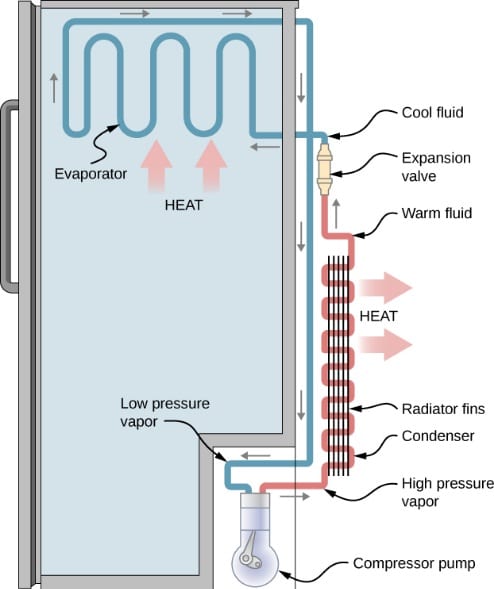 In a traditional refrigerator, coolant is pressurized to turn into gas as it flows into the outside coil. Then, it becomes liquid again after making contact with the cool air in the kitchen. At a high temperature, this liquid absorbs the heat inside the freezer as it enters the unit’s interior coil.