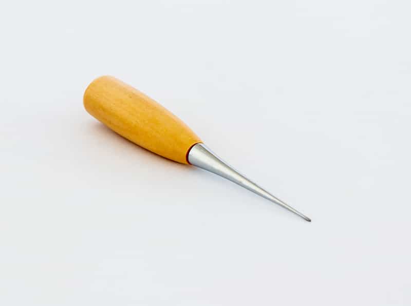 A stitching awl consists of several components. The most distinct is the wooden handle with two holes—a big one where the bobbin is placed and a small one where the thread goes to be pulled out.